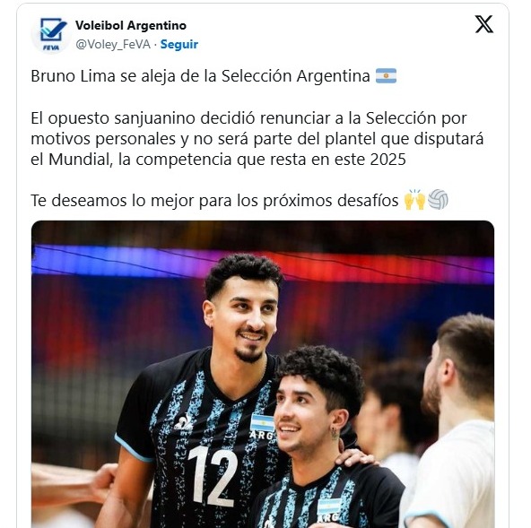 El opuesto Bruno Lima, uno de los héroes del bronce en Tokio 2020, decidió bajarse del equipo que conduce Marcelo Méndez por «motivos personales» y el jugador no será parte de la Copa del Mundo que se va a jugar en Filipinas entre el 12 y 28 de septiembre próximo.