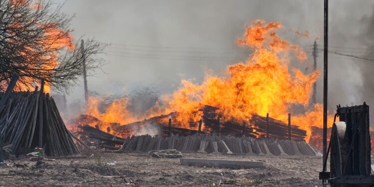 En horas de la tarde, un voraz incendio se desató en una finca ubicada sobre Avenida de los Ríos, en Caucete, justo detrás del conocido boliche El Cortijo. El fuego, de grandes dimensiones, consumió rápidamente un sector donde se encontraban almacenados palos de producción agrícola y amenazó con alcanzar un galpón ubicado a pocos metros.