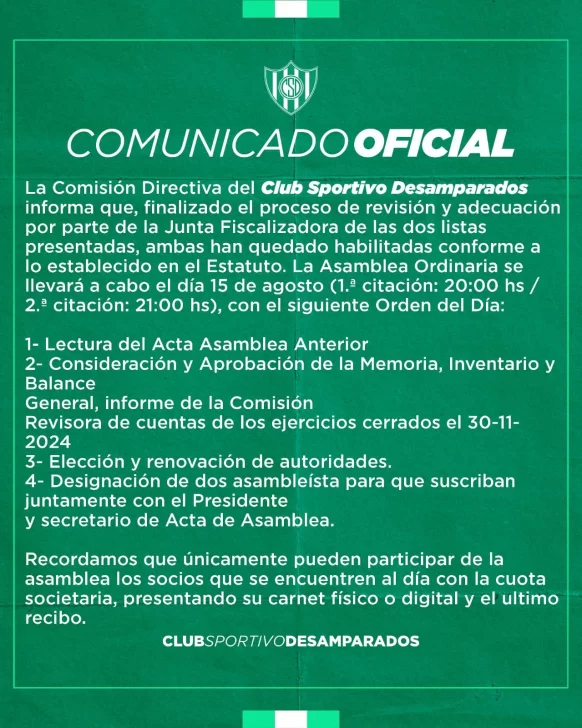 Ante esa situación, desde el Club emitieron esta tarde un comunicado donde ratificaron la Asamblea: “La Comisión Directiva del Club Sportivo Desamparados informa que finalizado el proceso de revisión y adecuación por parte de la Junta Fiscalizadora de las dos listas presentadas, ambas han quedado habilitadas conforme al Estatuto. La Asamblea se llevará a cabo el viernes 15 con la primera citación a las 20 horas y el segundo llamado a las 21″, expresa el comunicado.