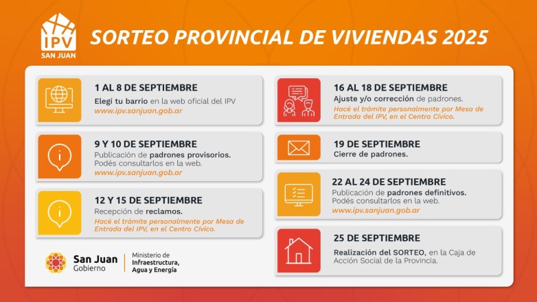 El Instituto Provincial de la Vivienda (IPV) informa el cronograma oficial para participar del Sorteo Provincial de Viviendas – San Juan 2025. Se trata de unidades habitacionales que no fueron adjudicadas en sorteos anteriores. El sorteo público se realizará el 25 de septiembre en la Caja de Acción Social de la Provincia.
