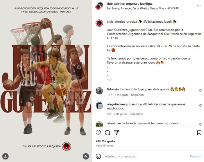 Juan Gutiérrez jugador de Urquiza ha sido preseleccionado argentino U17 Masculina. Estas jornadas de concentraciones son previas al Campeonato Sudamericano. La concentración comenzará el próximo 25 al 28 de agosto en Villa Cañás, Santa Fe.