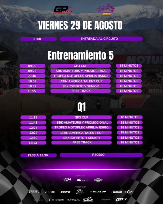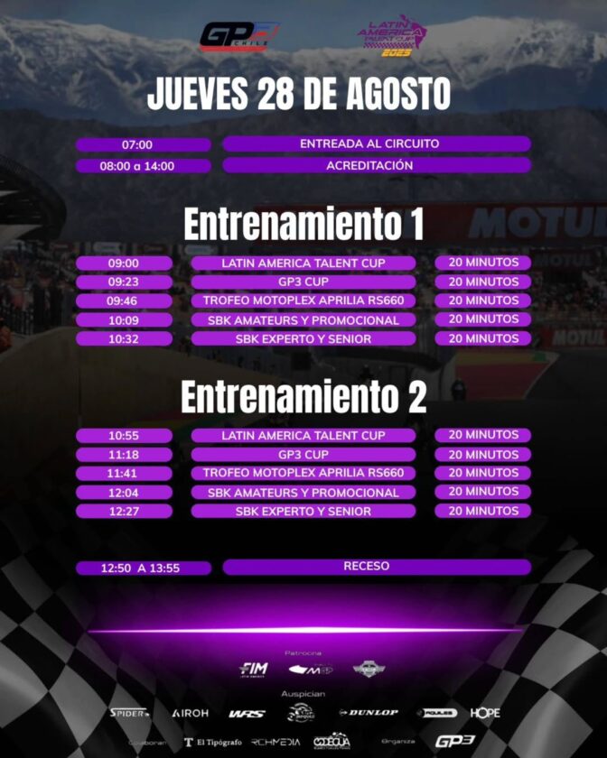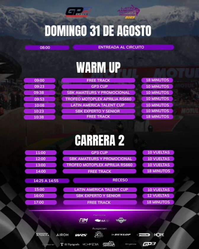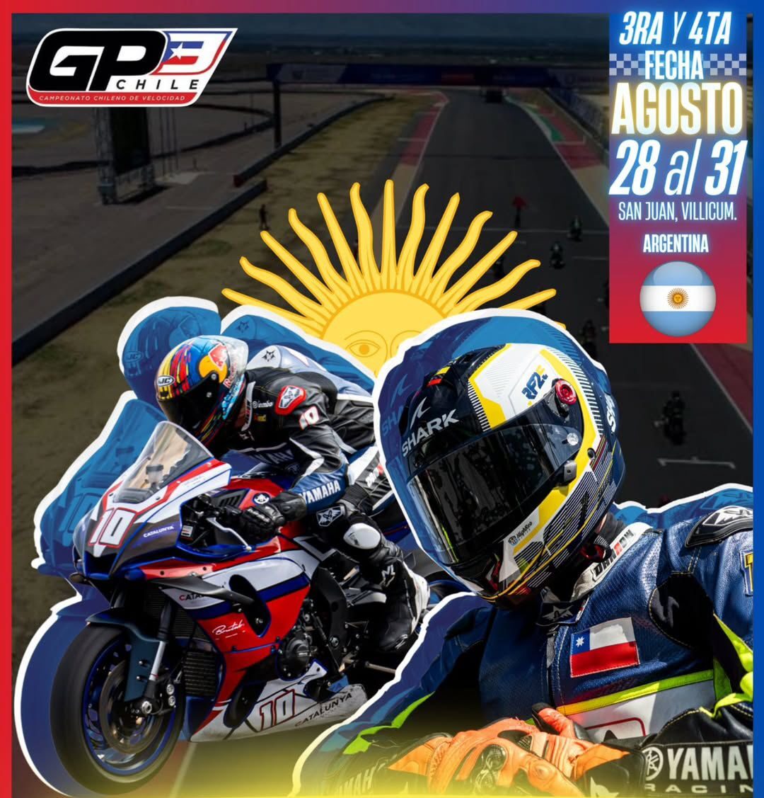 El Campeonato Chileno de Motociclismo de Velocidad llega al Circuito San Juan Villicum. El GP3 correrá la 3er y 4ta fecha del Campeonato en el autódromo albardonero. Lo hará junto a La Latin America Talent Cup llegan a tierra albardonera. Sé correrá la 5ta y 6ta fecha del campeonato de jóvenes motociclistas, todo del 28 al 31 de agosto.