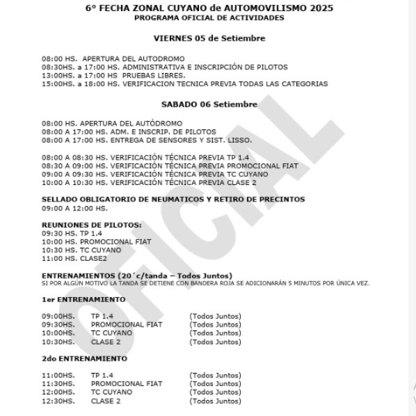 El fin de semana del 6 y 7 de septiembre, el Circuito San Juan Villicum recibirá por segunda vez en el año al Campeonato Zonal Cuyano de automovilismo en lo que será la sexta fecha de la temporada, con las cinco categorías que vienen disputando el campeonato: Clase 2, Fórmula Cuyana, Turismo Pista 1.4, Promocional y TC Cuyano.