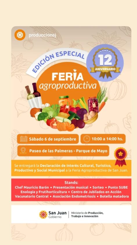 El Paseo de las Palmeras del Parque de Mayo se vestirá de gala este sábado 6 de septiembre para recibir la edición aniversario de la Feria Agroproductiva de San Juan, que celebra sus 12 años de trabajo ininterrumpido apoyando a los emprendedores locales.