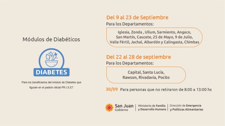 El Ministerio de Familia y Desarrollo Humano, a través de la Dirección de Emergencia y Políticas Alimentarias, informa que el martes 9 de septiembre comienza una nueva etapa de entrega de módulos alimentarios destinados a personas con diagnóstico de diabetes, en toda la provincia.