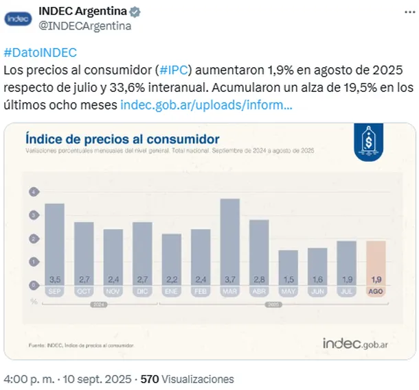 El Indec confirmó este miércoles que el índice de precios al consumidor registró en agosto una suba del 1,9%, en línea con lo proyectado por las consultoras privadas. Con este resultado, la inflación acumulada en los últimos doce meses trepó al 33,6%, mientras que en lo que va de 2025 la variación alcanza el 19,5%.