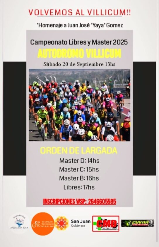 Esta fecha 6 de torneo de criterium para libres y máster confirmó que se mudará momentáneamente al circuito San Juan Villicum en Albardón el Sábado 20 del presente mes con todos los horarios definidos: