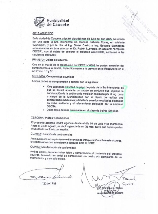 Al mes siguiente de la auditoría, en julio, ambas partes firmaron un acuerdo para cumplir con la resolución del EPRE, y establecieron que cualquier «diferencia sería sometida a la consulta» de ese organismo.