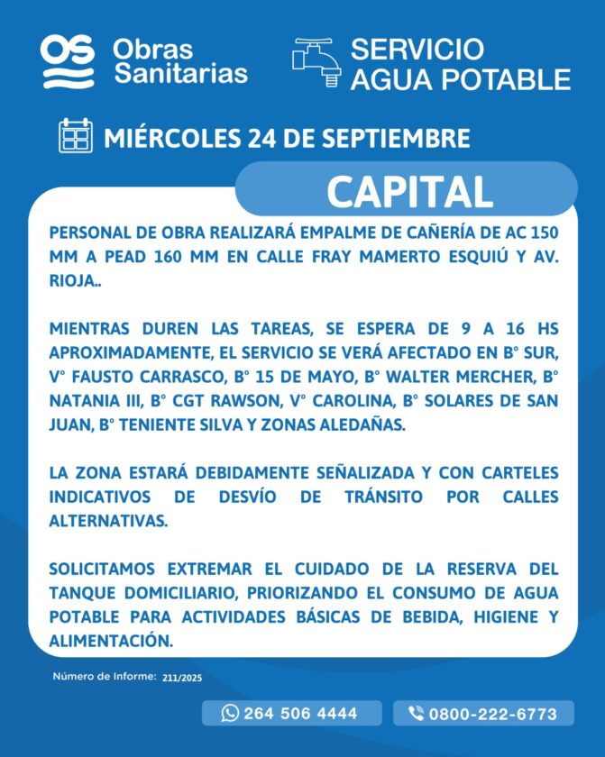 Mientras se realicen los trabajos la calzada estará reducida en Av. Rioja desde calle Estrada hasta Fray Mamerto Esquiú y el servicio de agua potable se verá afectado en Bº Sur, Vº Fausto Carrasco, Bº 15 de Mayo, Bº Walter Mercher, Bº Natania III, Bº CGT Rawson, Vº Carolina, Bº Solares de San Juan, Bº Teniente Silva y zonas aledañas.