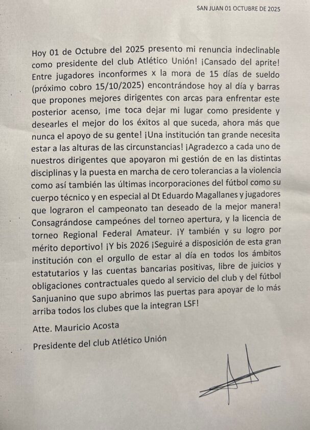 A menos de un mes del inicio del Torneo Regional Federal Amateur, Mauricio Acosta presentó su renuncia como presidente del Club Atlético Unión.