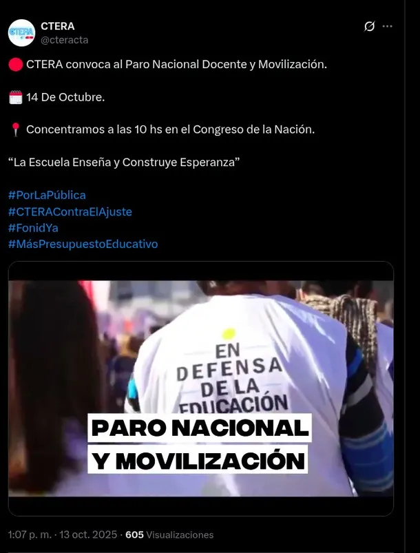 A través de su perfil de X la asociación gremial llamó en las últimas horas a una concentración frente al Congreso de la Nación a las 10 de la mañana del martes bajo el lema «La Escuela Enseña y Construye Esperanza».