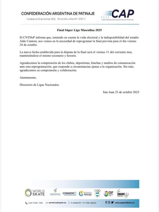 Para mañana estaba previsto en el estadio Aldo Cantoni la última final para decidir al campeón de la Superliga de hockey sobre patines en los hombres entre Richet Zapata y Centro Valenciano, pero finalmente no se hará debido al proceso de elecciones que se viene, o al menos ese es el argumento oficial.