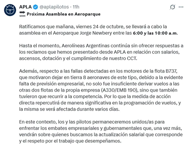 En tanto, los pilotos indicaron que la medida se adopta dado que, “hasta el momento, Aerolíneas Argentinas continúa sin ofrecer respuestas a los reclamos que hemos presentado desde APLA en relación con salarios, ascensos, dotación y el cumplimiento de nuestro CCT”.