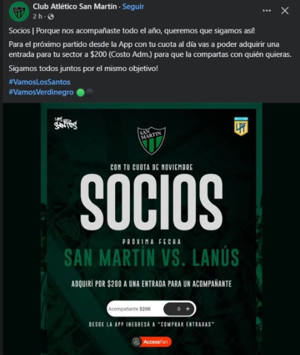 Lanzó una promoción para sus socios, un 2 x 1 se podría decir, consiste en aquel socio al día pagado solo 200 pesos, la posibilidad de llevar a un acompañante, para tener un estadio a pleno de hinchas verdinegros para meter presión al rival y brindar todo el apoyo posible al equipo en este partido trascendental.