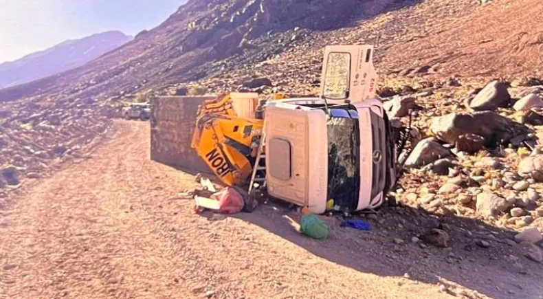 Este jueves en Calingasta, un camión dedicado a servicios mineros protagonizó un vuelco cerca de las 16 horas mientras descendía desde la mina Los Azules a alta velocidad. El vehículo pertenece a la empresa Servicios Sánchez y, según reportes, la excesiva velocidad fue la causa del accidente.