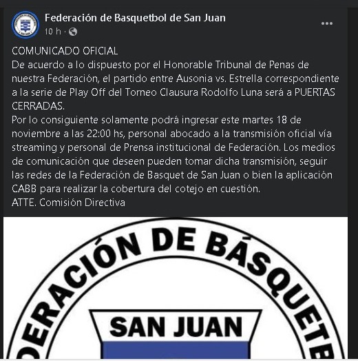 El Tribunal de Penas de la Federación de Básquet de San Juan dictaminó la suspensión por 10 partidos para los jugadores Santiago Padilla e Ismael Terluk, ambos de Ausonia, y para Nicolás Bustos de Estrella. En tanto, a los espectadores involucrados, identificados como Gonzalo Bustos (Estrella), Manuel Romero y Juan Terluk (Ausonia), se les impuso una prohibición de ingreso a los partidos organizados por la Federación por un período de 2 años.