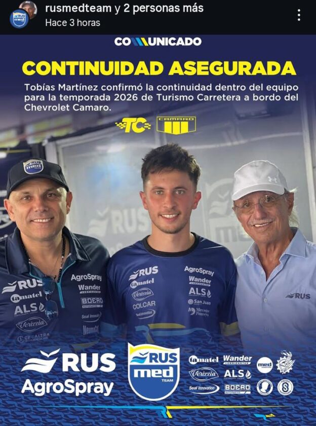 El piloto sanjuanino Tobías Martínez cerró el año en el Turismo Carretera con resultados por debajo de sus expectativas, pero su esfuerzo se vio recompensado con una importante noticia. Martínez, históricamente ligado a la marca Chevrolet, anunció que para la temporada 2026 pilotará un Chevrolet Camaro dentro del equipo RUS Med Team.