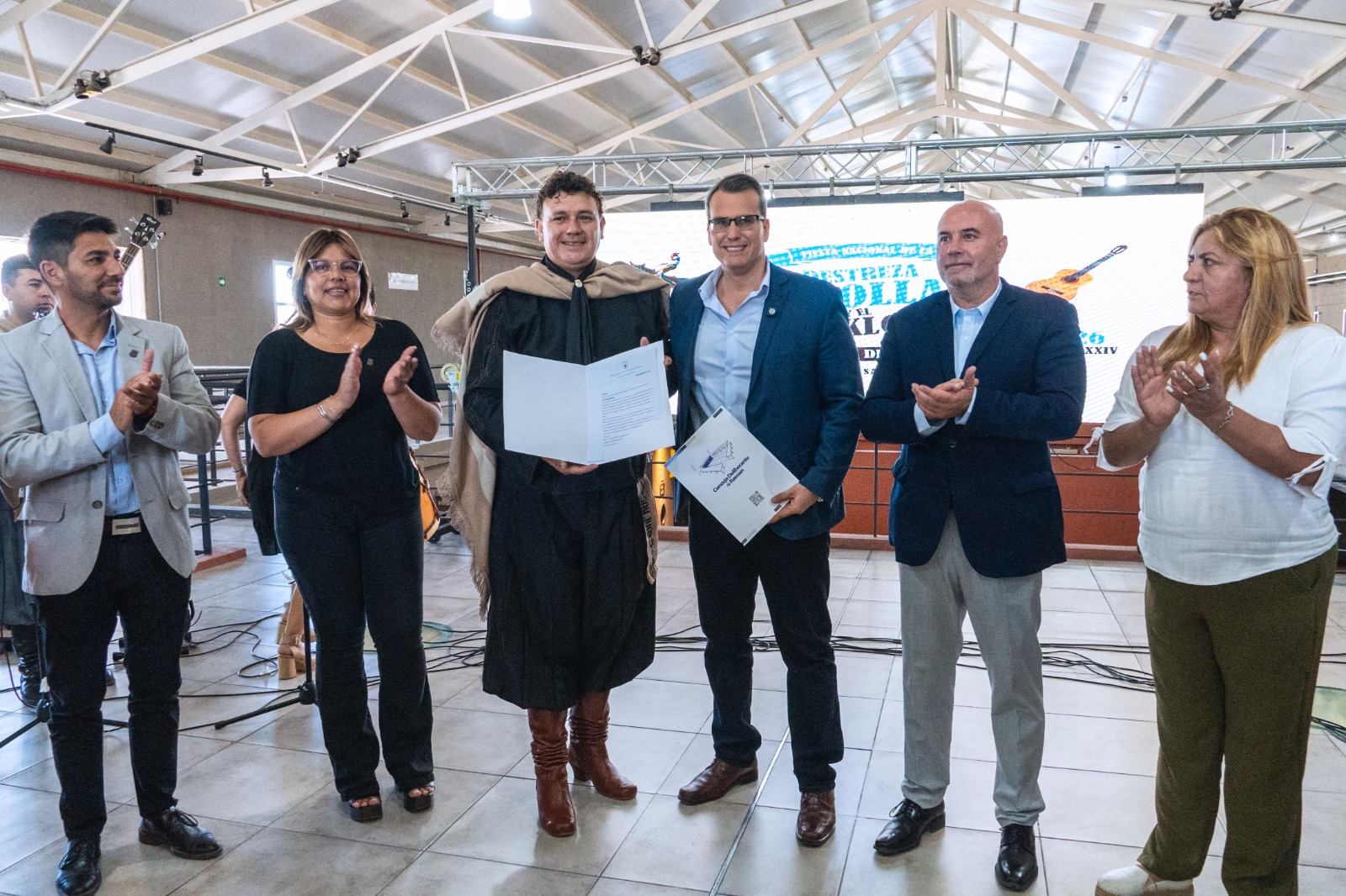 Durante el acto, el compositor sanjuanino Diego Villegas interpretó la cueca “Al Médano de Oro”, elegida como canción oficial del Festival de Doma y Folclore Médano de Oro 2025. En ese marco, el Concejo Deliberante de Rawson entregó la Declaración de Interés a la obra, distinción recibida por el propio artista.