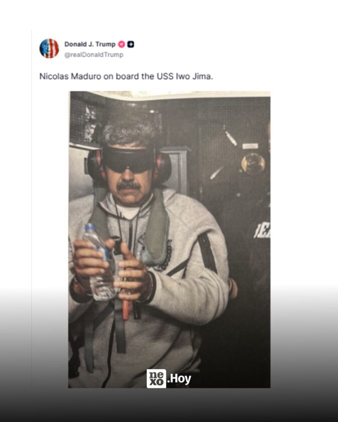 El presidente de Estados Unidos, Donald Trump, publicó este sábado en su cuenta de la red social Truth la primera foto de Nicolás Maduro tras su captura en Venezuela a manos de fuerzas especiales estadounidenses.