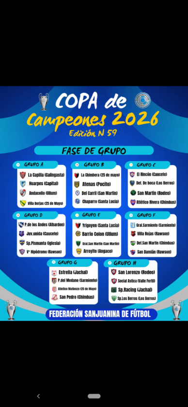 Se realizó el sorteo para definir las zonas y los partidos por parte de la federación sanjuanina de fútbol, quedó de la siguiente manera:
