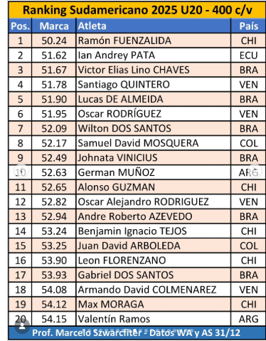 Ramos ocupa el puesto 20 del ranking, con una marca de 54.15 segundos, compitiendo en una tabla que reúne a atletas de países como Brasil, Chile, Venezuela, Colombia, Ecuador y Argentina. El listado refleja el rendimiento de los mejores exponentes juveniles del continente y es una referencia clave para el desarrollo competitivo a nivel internacional.