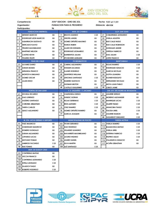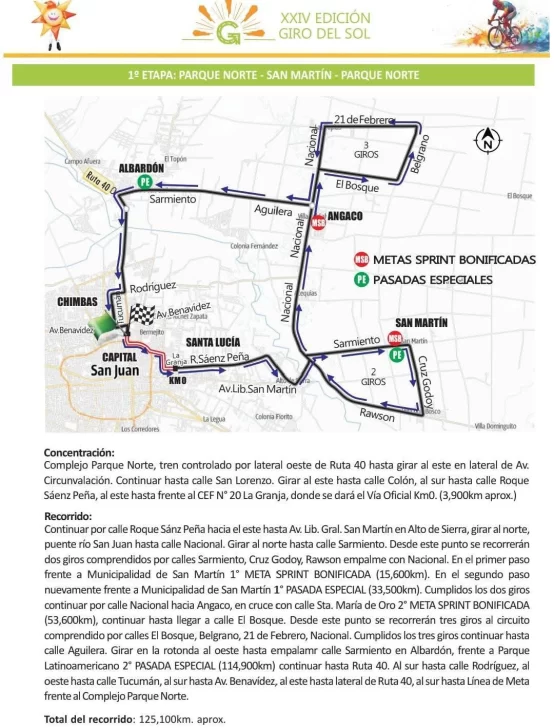 La primera etapa, el viernes 9 de enero desde las 15hs, tendrá salida y llegada en el Complejo Parque Norte, en Capital, con un recorrido de poco más de 125 kilómetros que pasará por San Lucía, San Martín, Angaco, Albardón y Chimbas. Será una jornada dinámica, con metas sprint bonificadas y un trazado que exigirá atención desde el inicio.