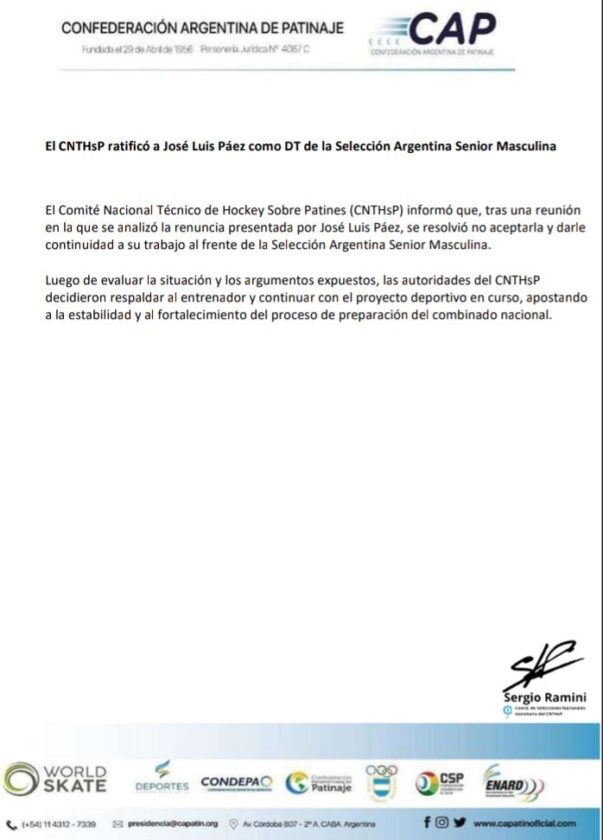 Finalmente la Confederación argentina de patinaje no le aceptó la renuncia, esto dice el comunicado oficial: