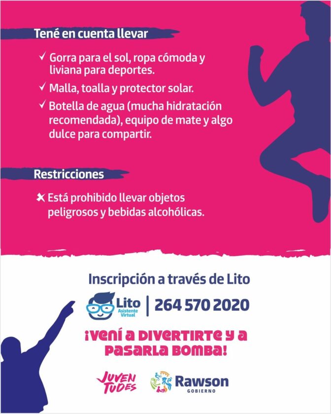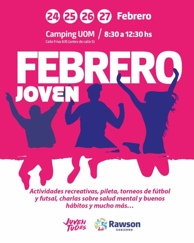 La Municipalidad de la Ciudad de Rawson, a través del área de Juventudes, invita a participar de Febrero Joven, un programa especialmente diseñado para brindar a las juventudes un espacio de recreación y formación, que se desarrollará en el Camping de la UOM.