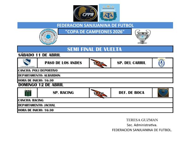 La copa de campeones para el fútbol masculino conocerá este fin de semana a sus finalistas, se jugarán las semifinales, partidos de vuelta, y ya está todo definido por parte de la federación sanjuanina.