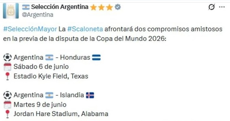 La Selección Argentina ya tiene confirmados sus últimas dos pruebas antes de iniciar la defensa del título máximo. Será contra Honduras, el 6 de junio en Texas, e Islandia, el 9 en Alabama.