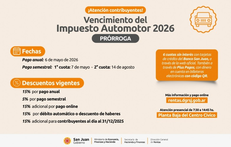 Además, los contribuyentes podrán abonar el impuesto anual y semestral en hasta 6 cuotas sin interés con tarjetas del Banco San Juan, facilitando el cumplimiento de la obligación tributaria.