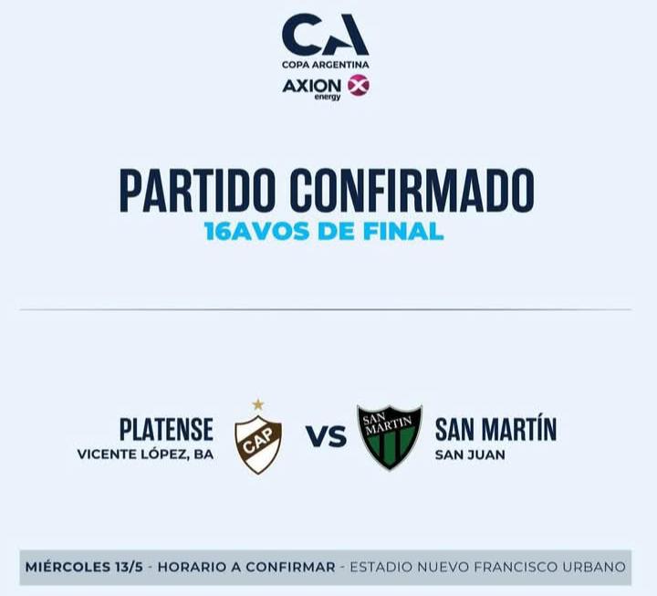 San Martín y Platense, por los 16avos de final, se disputará el miércoles 13 de mayo, aunque todavía resta definir el horario. El encuentro se jugará en el estadio de Morón, en la provincia de Buenos Aires.